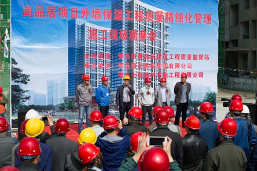 觀摩會當天,集團副總裁馬志驍、七分公司總經(jīng)理朱超等陪同黃島區(qū)質(zhì)監(jiān)站領導進行了現(xiàn)場觀摩,上午9:00黃島區(qū)質(zhì)監(jiān)站領導主持了現(xiàn)場觀摩會,對照實體樣板詳細講解保溫工程各工序質(zhì)量保證要點。主要就工程實體保溫工程界面劑噴涂、玻纖網(wǎng)粘貼、加強層粘貼、窗洞口巖棉套割、錨栓固定等施工工藝進行了講解并宣布現(xiàn)場觀摩開始。黃島區(qū)各與會單位人員現(xiàn)場觀摩了實體工序樣板,各單位間相互切磋工藝做法,交流標準化管理經(jīng)驗。上午11:00觀摩人員陸續(xù)離開施工現(xiàn)場,現(xiàn)場觀摩會圓滿結(jié)束。